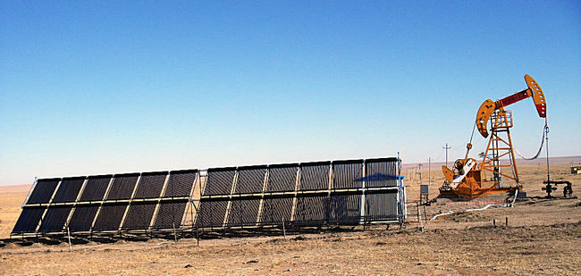 工藝流程:將太陽(yáng)能集熱來(lái)的熱工質(zhì),通過(guò)加壓泵加入空心桿內(nèi)管中,熱工質(zhì)沿內(nèi)管向下循環(huán),到底部,再到管外(桿內(nèi))往上方流動(dòng)將熱量通過(guò)桿壁傳給原油,周而復(fù)始;原油溫度升高,被加熱后降粘的原油,由抽油桿提到地上,再由輸油管道輸走。從而達(dá)到_理想的降粘目的。